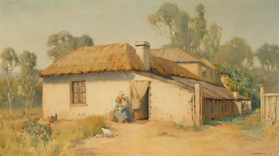 This is a much later painting of William’ Light’s cottage into which he moved in early 1839 after the disastrous fire that destroyed most of his papers and belongings. The original house, named after his childhood home at Theberton in Suffolk with the Doughty’s was more impressive. By the time of this painting, the cottage had fallen into disrepair. It is now in the suburb referred to as ‘Thebarton’.